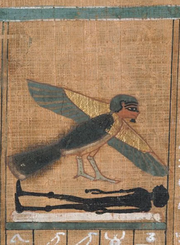 In beiden Kulturen findet man ähnlich Bildnisse. Vor allem in Ägypten hat es damit aber eine besondere Bewandtnis auf sich. Es handelt sich um so genannte Seelenvögel, also um bildliche Darstellungen eines Teils der menschlichen Seele als Vogel, der nach dem Tod davonfliegt (und auch wieder zurückkehren kann).