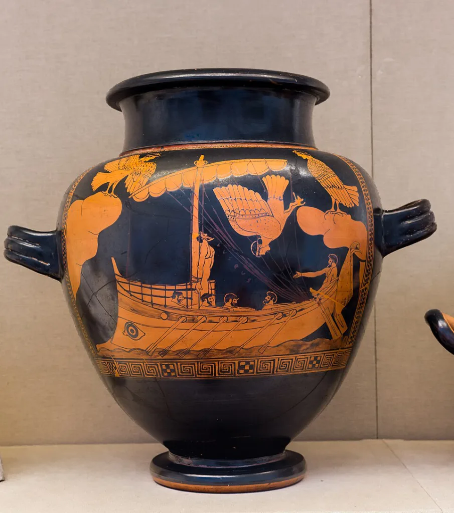 Die Flügel beziehungsweise der Vogelkörper sind das auffälligste Feature der Sirenen. Man findet ihn nicht nur in der Literatur, sondern auch in bildlichen Darstellungen, zum Beispiel auf Vasen. Und diese Darstellungen erinnern erstaunlich an Bilddarstellungen benachbarter Kulturräume, nämlich Ägypten und Mesopotamien.