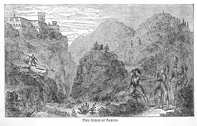 Kyros kam bei der Belagerung von Sardeis schließlich der Zufall zur Hilfe. Ein lydischer Soldat, der auf den Zinnen der Stadtmauer Wache hielt, verlor seinen Helm. Er kletterte an einer Stelle den Felsen hinunter, um ihn zurückzuholen.